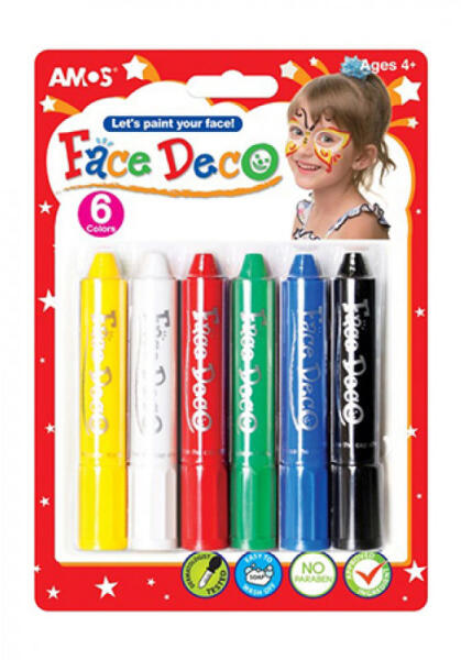 6 db-os arcfestő készlet sárga, fehér, piros, zöld, kék és fekete színekben. A termék illatanyagot nem tartalmaz, használat után szappanos vízzel lemosható.