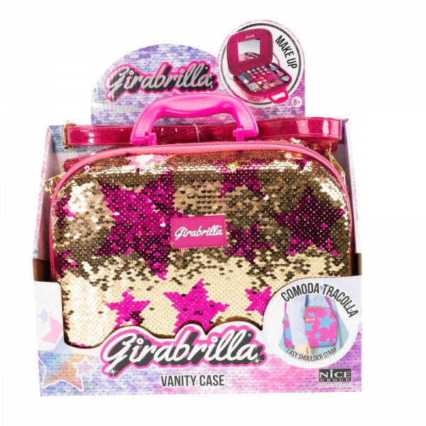 Girabrilla flitteres tok tükörrel és sminkfelszereléssel . Make-up és manikűr kozmetikumokat tartalmaz Aplikációk a tokon (kétoldalas flitterek) A tok nyitott kartondobozban .