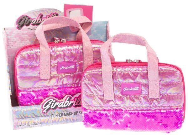 Girabrilla smink táska tükörrel és kiegészítőkkel . Make-up termékeket tartalmaz Puff és flitter kombináció Táska nyitott kartondobozban