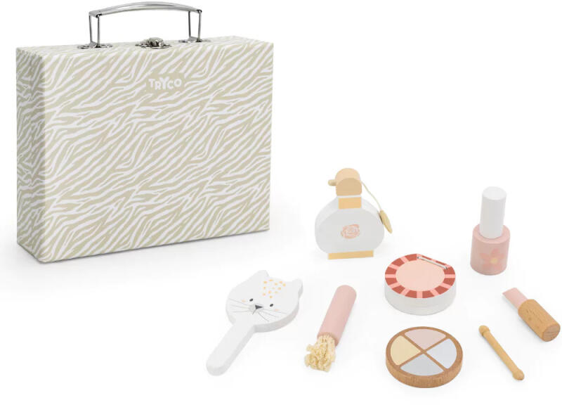 A szett különböző fából készült játék szépségápolási terméket tartalmaz. Az elmaradhatatlan rúzs, a szemhéjfesték, egy üveg parfüm, körömlakk és az elengedhetetlen tükör mind a készlet része, s a praktikus táskában bárhová elvihetjük magunkkal. A smink készlet, aminek használatával a lakás garantáltan rúzsfolt mentes marad!